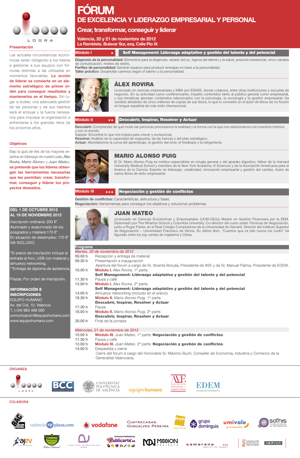 El Fórum se divide en tres grandes módulos. En el primero, Álex Rovira aportará la clave sobre cómo tratar al ser humano en su módulo “Self Management. Liderazgo adaptativo y gestión del talento y del potencial”. El segundo “Descubrir, Inspirar, Resolver y Actuar”, a cargo de Mario Alonso Puig, abordará la curva del aprendizaje, la gestión del error, el feedback y la reingeniería. Y en el tercer módulo, Juan Mateo, recorrerá las diferentes fases del proceso de “Negociación y gestión de conflictos”.