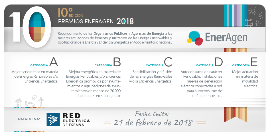 En esta décima edición, se premiarán aquellas actuaciones desarrolladas durante 2017 bajo cinco categorías, entre las que se mantienen las tradicionales de mejor actuación en materia de eficiencia energética y energías renovables, la categoría de mejor actuación de sensibilización y difusión y la categoría que está dirigida exclusivamente a las actuaciones promovidas por ayuntamientos pequeños, de menos de 20.000 habitantes, que hayan apostado significativamente por el desarrollo sostenible. Y en esta edición hay dos nuevas categorías: Mejor actuación en materia de autoconsumo de carácter renovable, para instalaciones nuevas de generación eléctrica conectadas a red para autoconsumo y Mejor actuación en materia de movilidad eléctrica.