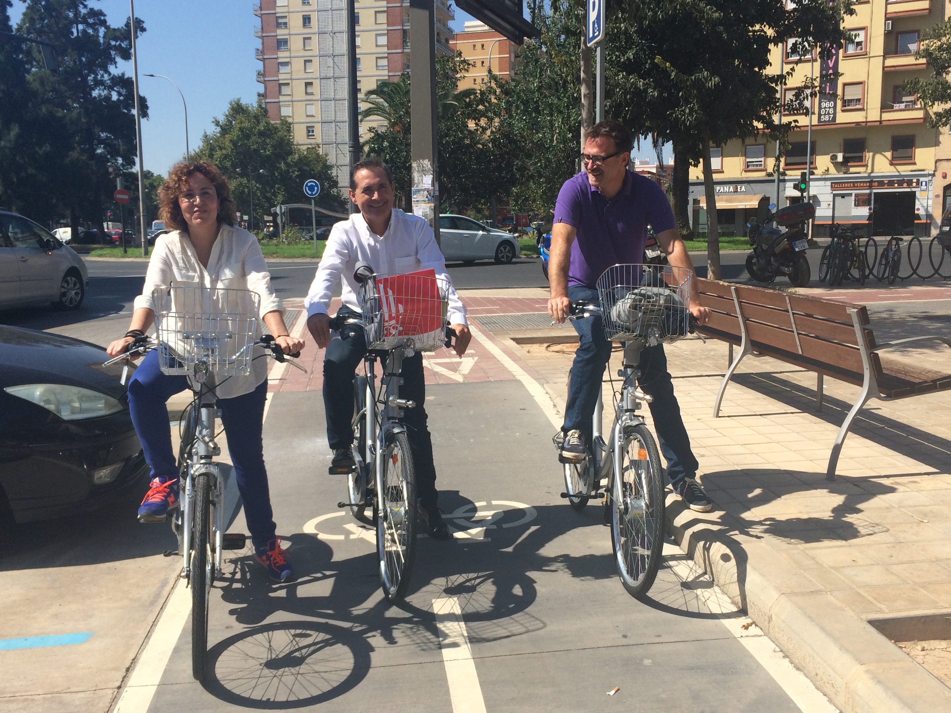 La directora general del IVACE, Júlia Company, acompañada por el concejal de Movilidad del Ayuntamiento de València, Giussepe Grezzi, y el presidente de la Comisión de Movilidad de la Mancomunitat de L'Horta Sud, Michel Montaner, han inaugurado las bases intermodales que posbilitarán los desplazamientos entre los usuarios de Valenbisi y los de los municipios de su Área Metropolitana (Mibisi) (19-9-2017)
