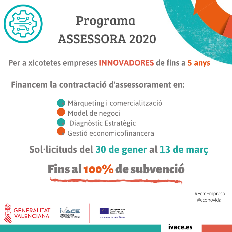 Hui s'obri el termini perquè les xicotetes empreses innovadores menors de cinc anys presenten les seues sol·licituds a la convocatòria ASSESSORA de l´Ivace dotada amb un pressupost d'1.750.000 euros amb co finançament europeu (FEDER) (30-1-2020)