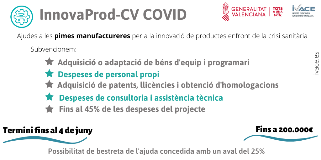 La Conselleria d'Economia Sostenible, Sectors Productius, Comerç i Treball, a través de Ivace Innovació, llança la convocatòria InnovaProD-CV COVIDper a fer costat a les xicotetes i mitjanes empreses industrials en el desenvolupament de projectes innovadors que ajuden a donar resposta a emergències sanitàries com les provocades pel COVID 19 (13-5-2020)